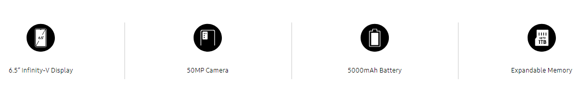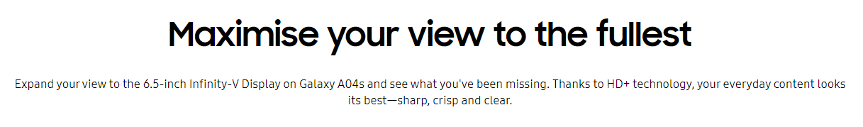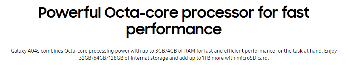 Samsung Galaxy A04sKey Features 6.5" Infinity-V Display Minimal Look, Quality Design Capture More Moments With Triple Camera Massive 5000mAh Battery Powerful Processor Fingerprint Sensor