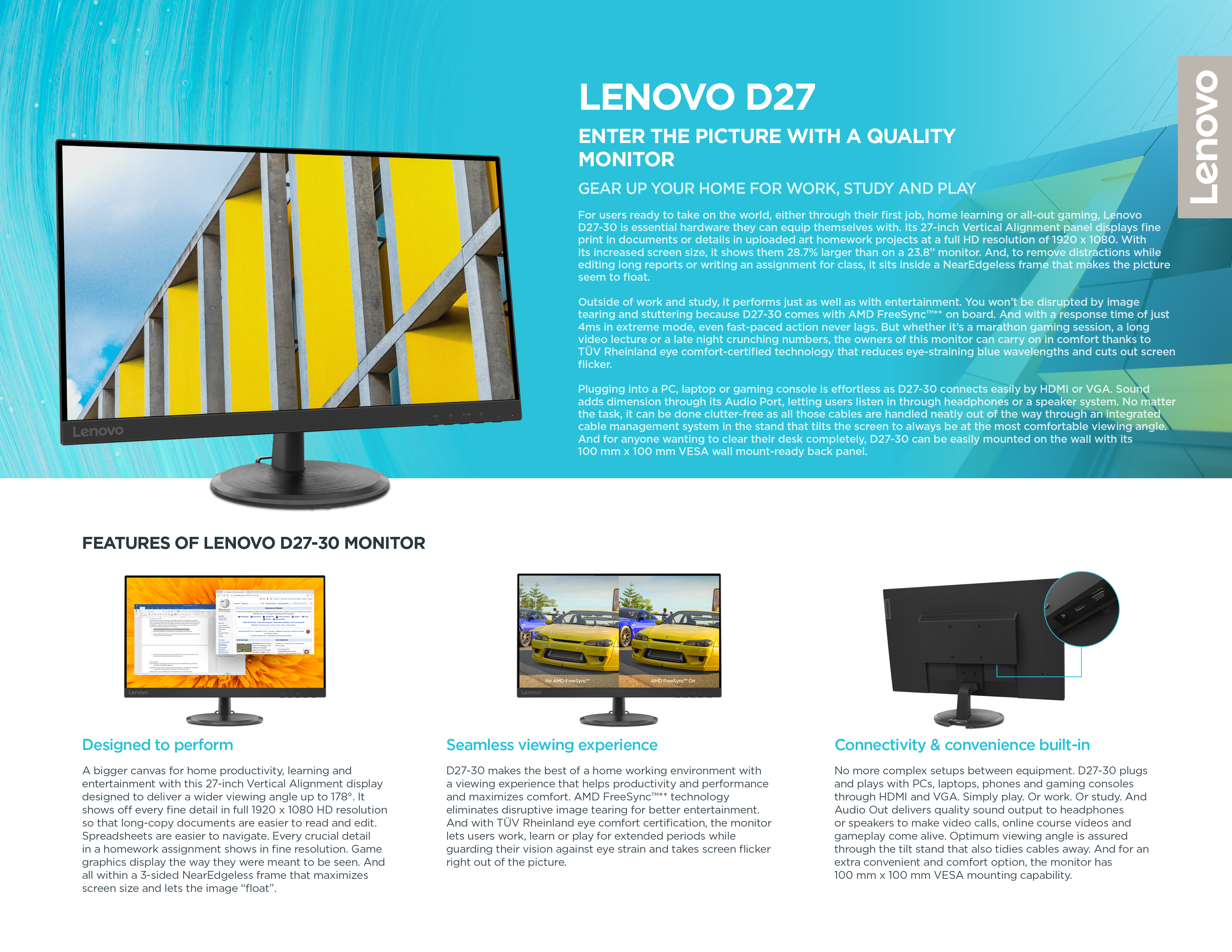 [BEST SELLER] Lenovo D27-30 27 Inch FHD 1920x1080 Monitor (66B8KAC6MY) 250nits | 72% NTSC 82 dpi | 4ms Response Rate | HDMI VGA Multiple Input | HDMI Cable Incl | 3Y Warranty